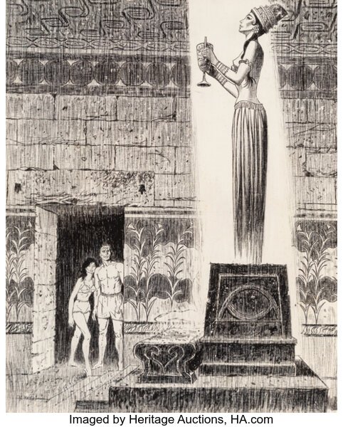 This painting predates Frazetta’s Conan the Adventurer/The Barbarian by at least five years. It provides a rough template: a bad-ass with a sword with a fine brunette clinging to him. Did Frank—or Roy G. Krenkel—see this one? Possibly.